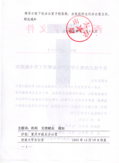 关于成立西南大学无偿献血领导工作小组通知(背面)