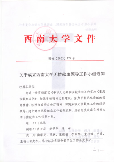 关于成立西南大学无偿献血领导工作小组通知(背面)