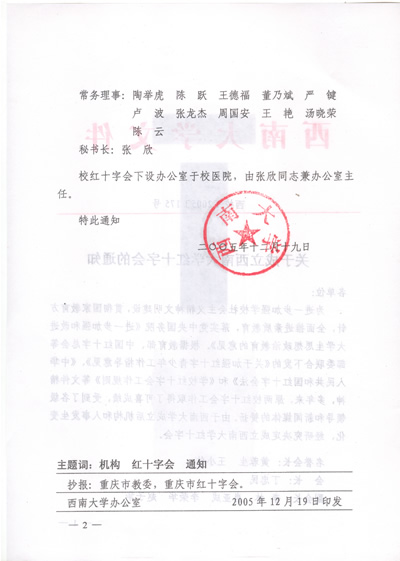 关于成立西南大学无偿献血领导工作小组通知(正面)